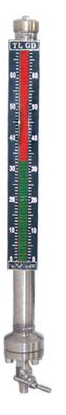 和被測容器形成連通器,保證被測量容器與測量管體間的液位相等。當液位計測量管中的浮子隨被測液位變化時,浮子中的磁性體與顯示條上顯示色標中的磁性體作用,使其翻轉,紅色表示有液,白色表示無液,以達到就地準確顯示液位的目的。
